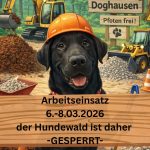 💚🐾 Aufruf an alle Mitglieder & Freunde des Hundewald Doghausen e.V. 🐾💚 Jetzt geht’s richtig los! 💪🌳 Nachdem wir den letzten Termin wetterbedingt verschieben mussten, starten wir neu durch: 📅 Freitag, 06.03. & Samstag, 07.03.🕙 Start jeweils um 10:00 Uhr im Hundewald (Eingang an der… Arbeitseinsatz 06.-08.03.2026 weiterlesen - Frühjahrsputz im Hundewald 2026Liebe Mitglieder und Freunde des Hundewalds am Samstag, den 07.02.2026 ab 10 Uhr, möchten wir gemeinsam unseren Hundewald fit für das Frühjahr machen. Der Arbeitseinsatz ist etwas spontan, aber das Wetter meint es aktuell gut mit uns. Jede helfende Hand zählt – egal ob groß… Frühjahrsputz im Hundewald 2026 weiterlesen